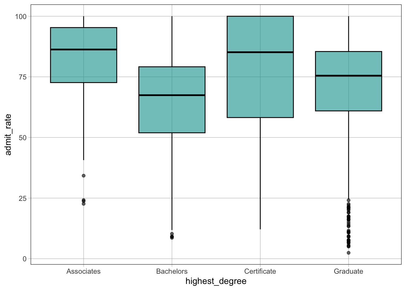 gf_boxplot(admit_rate ~ highest_degree, data = dat)Warning: Removed 2731 rows containing non-finite outside the scale range