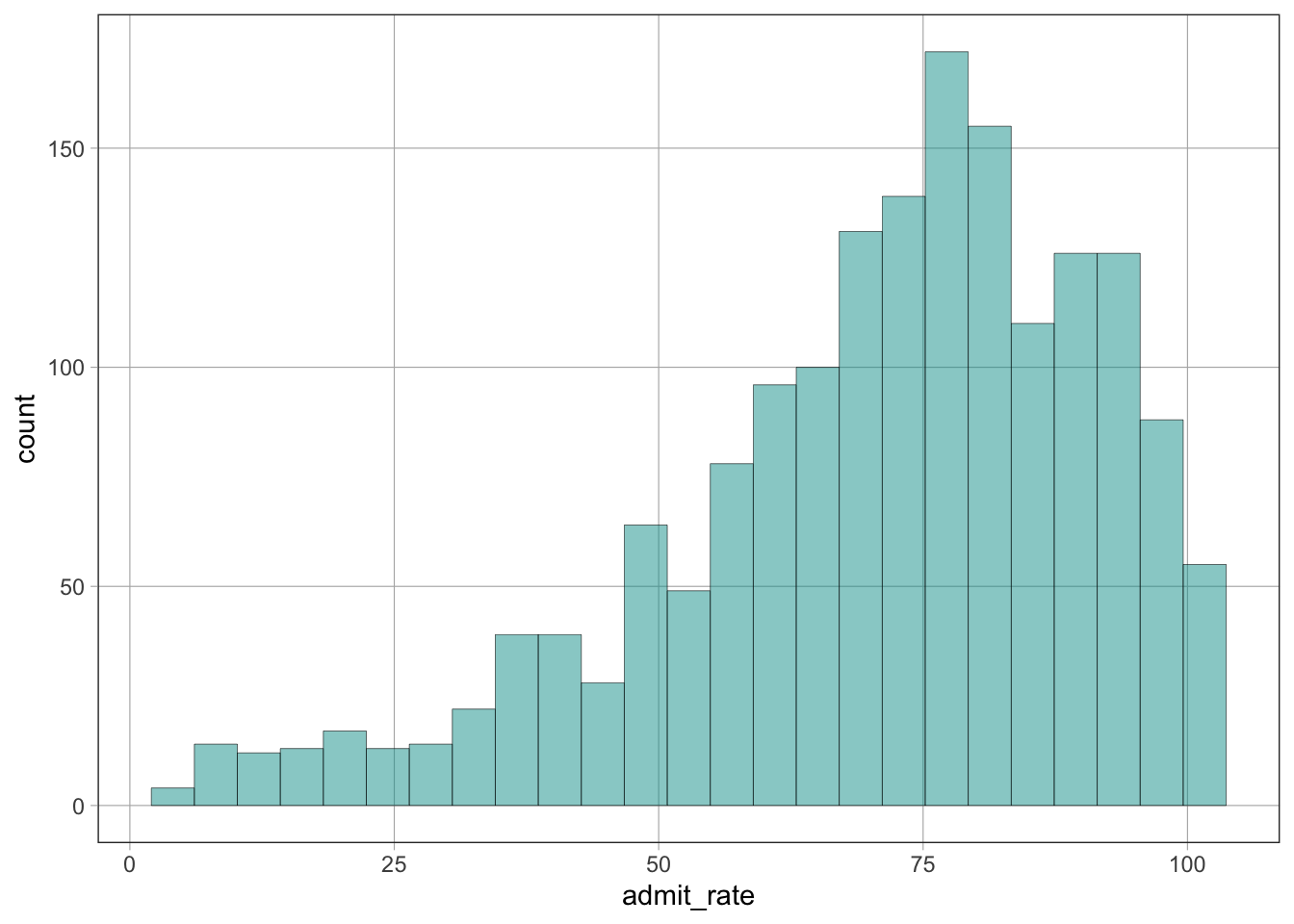 gf_histogram(~admit_rate, data = dat)Warning: Removed 2731 rows containing non-finite outside the scale range