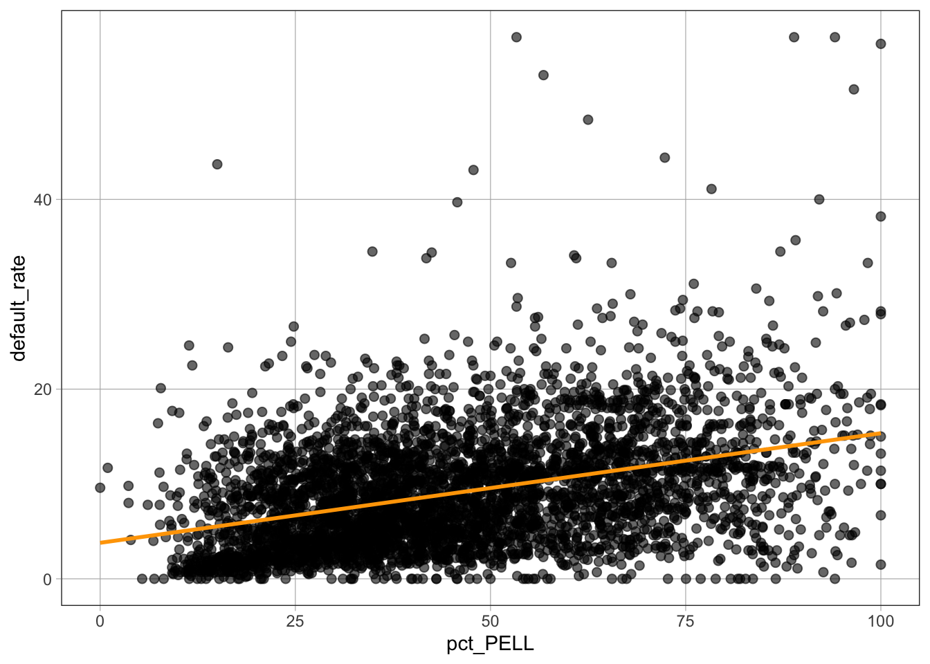 default_rate ~ pct_PELL specifies default rate on the \(y\)-axis and percent PELL on the \(x\)-axisdata = dat tells the function which dataset to use%>%) Pipe OperatorThe %>% operator pipes the result of one command into the next command. It is often used to layer models on top of graphs.